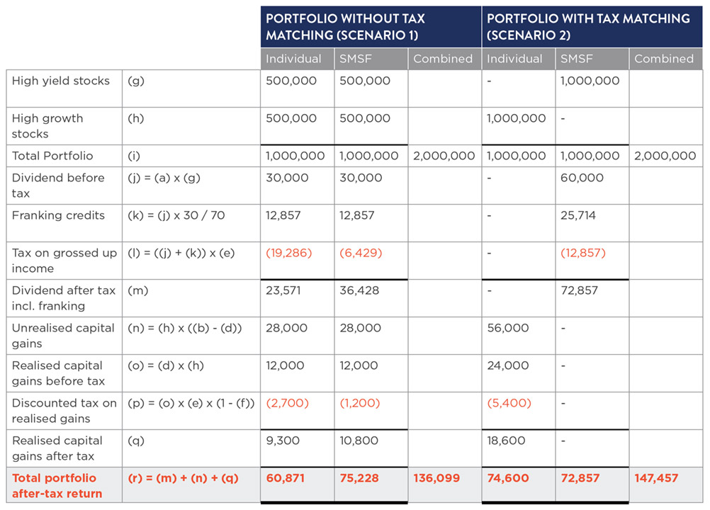 In scenario 1, an investor has a personal portfolio and superannuation portfolio with exactly the same holdings, half in high yielding stocks and the other half in high growth stocks.