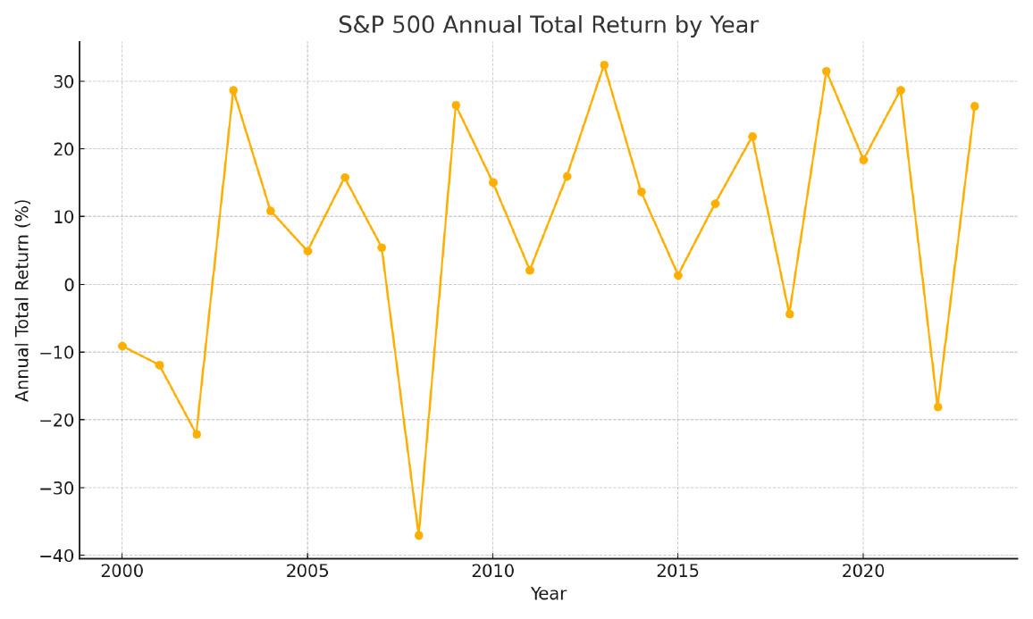 This brings us to Chart 3. It shows the annual returns from the S&P500 (a broad index of US stocks). Talk about fluctuations, Howard wasn’t wrong!