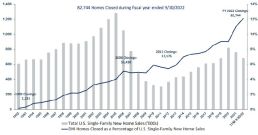 It might seem controversial after the doubling in mortgage rates in the US to be positive in the outlook for a residential home builder. DR Horton is the largest single family home builder in the US. Despite the boom in house prices there has not been a boom in construction levels, which have been modest by historical standards – this has been a very different boom to the one that eventually fed the economic crisis of 15 years ago. The chart below shows the number of homes constructed in the last 12 months was approximately 600,000 which is half the peak level and below the average over the last 30 years.